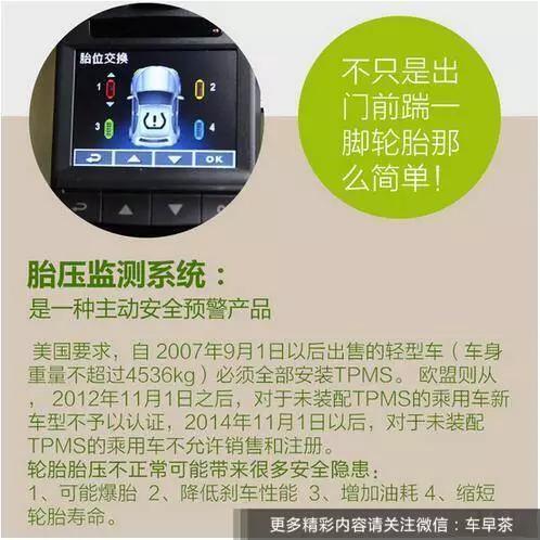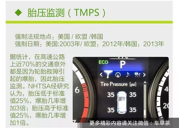 胎壓監測(TPMS)胎壓監測能夠在轎車(chē)行進(jìn)過(guò)程中對輪胎氣壓進(jìn)行實(shí)時(shí)主動(dòng)監測,在發(fā)作輪胎漏氣和低氣壓時(shí)進(jìn)行報警,以確保行車(chē)安全,是一個(gè)十分有用的裝備,在中國,胎壓監測通常都需求額定加裝,而美國和歐盟,分別在2007年和2012年就請求乘用車(chē)有必要悉數設備TPMS胎壓監測設備。