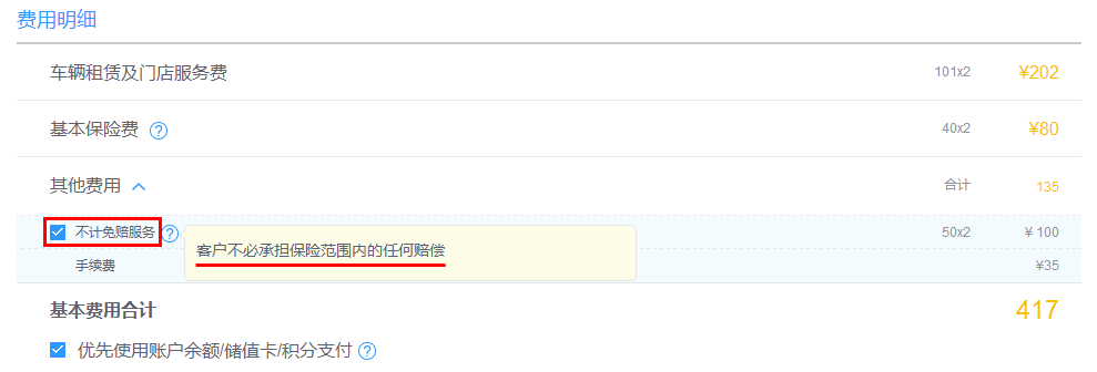 然后點(diǎn)擊租車(chē)到提交訂單頁(yè)面,這時(shí)分顯現的價(jià)格則是總價(jià)202元加上80元的穩妥費,又多出了一個(gè)35元的手續費用,還有一個(gè)不計免賠的服務(wù)(小技巧:租車(chē)的話(huà)最好選上),這就又多出100元,如果全都選上就是417元,這就是運用兩天的費用。當然租車(chē)是要用到信用卡的,朗逸這款車(chē)的預授權是3000元,也就是說(shuō)需求從信用卡先劃去3000元作為押金。